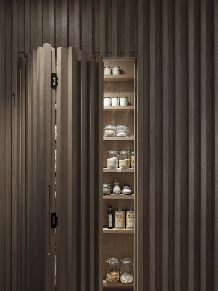 Tường gỗ thiết kế phá cách tạo thành hệ thống tủ âm tường, nơi mà gia chủ có thể lưu trữ gia vị nấu nướng và các vật dụng bếp.