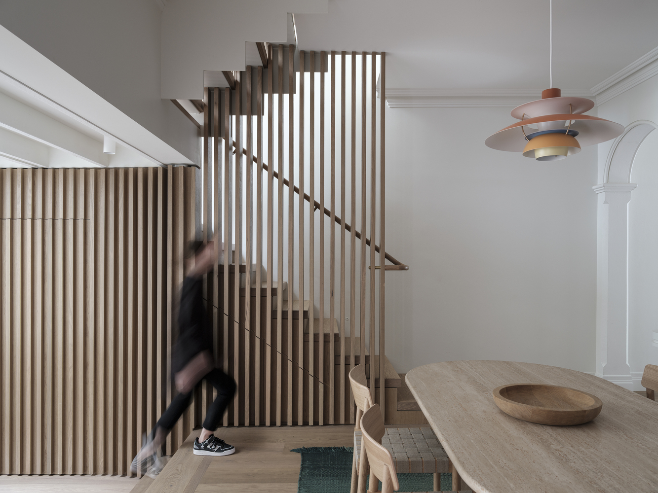 Các song gỗ tại khu vực cầu thang đóng vai trò là bức tường ngăn cách với phòng ăn nhưng vẫn đảm bảo sự thoáng sáng nhờ vào thiết kế sọc dọc, nhóm kiến trúc sư chia sẻ