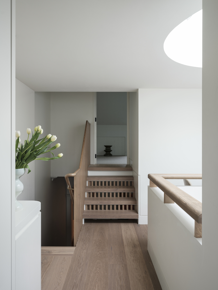 Cầu thang được làm bằng gỗ với màu sắc đồng nhất với nội thất gỗ trong nhà. Thiết kế của cầu thang không quá dốc và có tay vịn