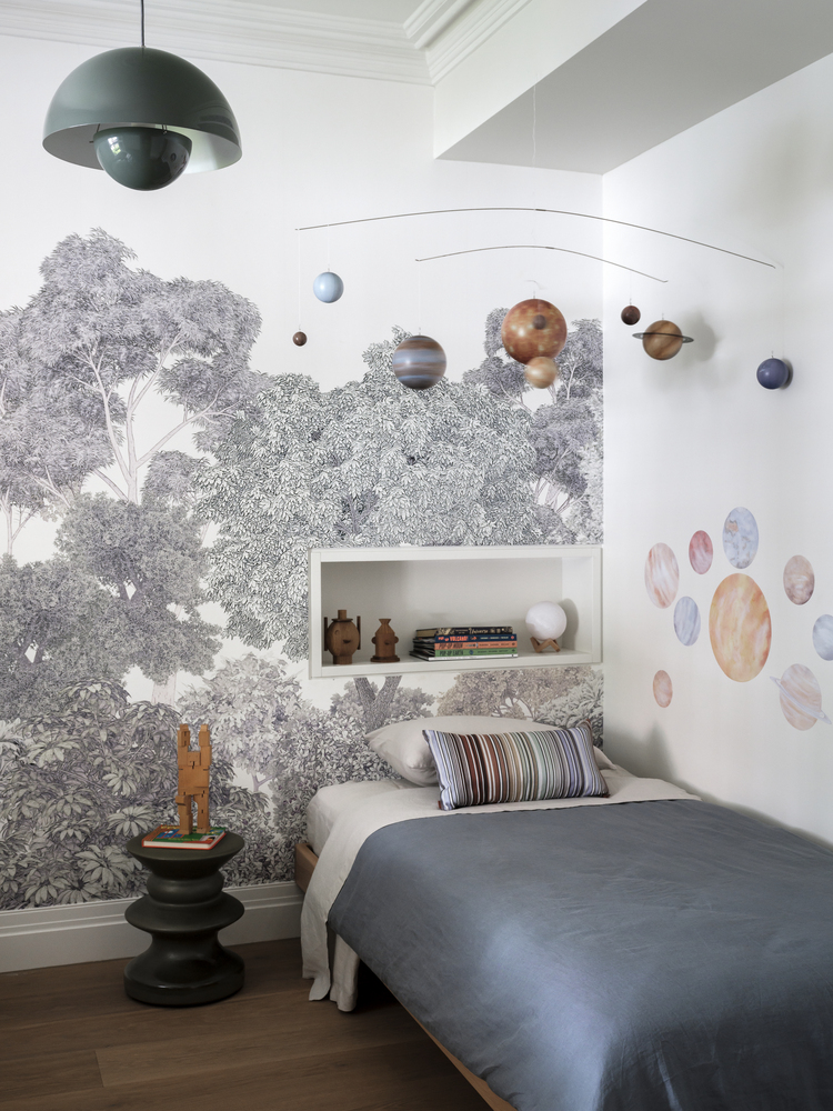 Phòng ngủ tạo điểm nhấn qua thiết kế đèn ngủ lấy cảm hứng từ các hành tinh trong dải ngân hà, một kệ sách âm tường thiết kế nhỏ gọn vừa vặn với không gian.