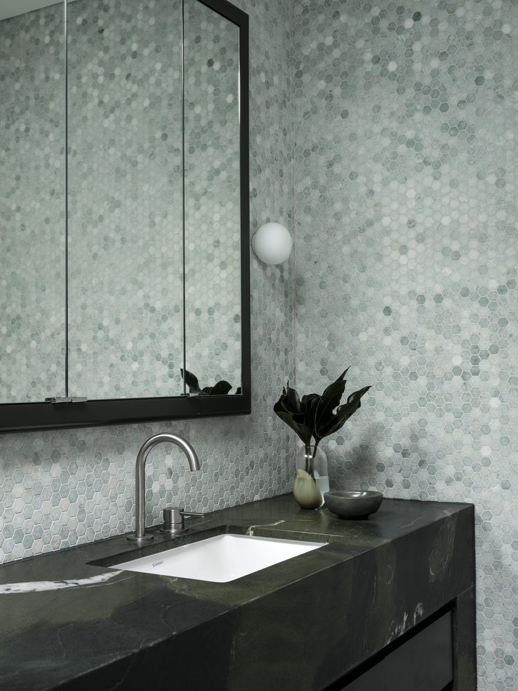 Xuyên suốt căn phòng vệ sinh là các mảng tường ốp đá màu xanh ngọc mang lại sự tươi mới, sạch sẽ. Bồn rửa mặt và tủ gương lớn mang lại sự tiện lợi trong sinh hoạt hàng ngày cho gia chủ.
