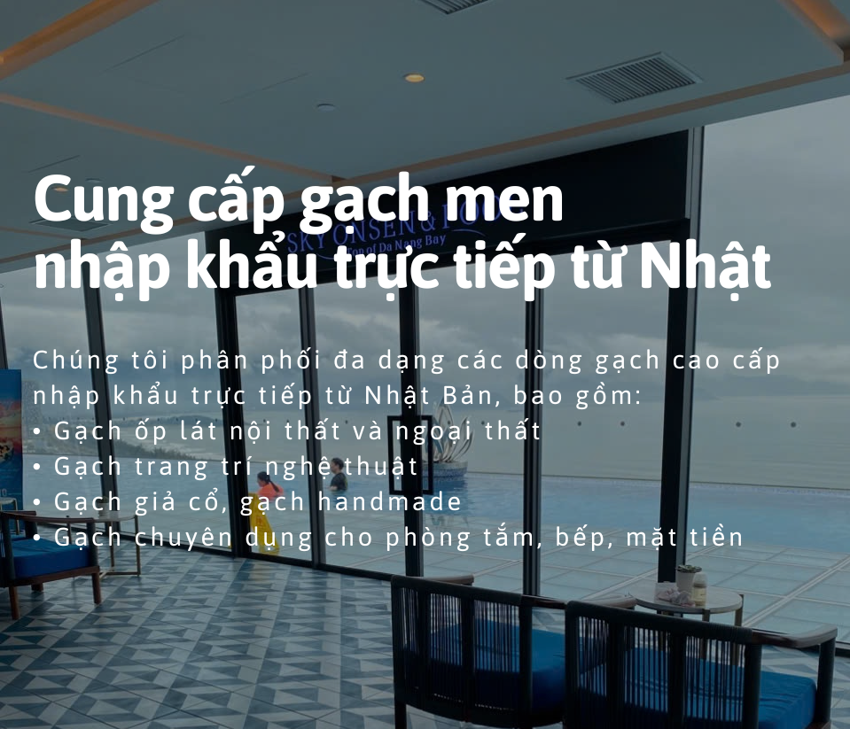 Gạch Nhật Bản chính hãng nổi tiếng với chất lượng vượt trội, độ bền cao và tính thẩm mỹ tinh tế trong từng chi tiết. Mỗi sản phẩm đều thể hiện sự tỉ mỉ và tinh thần “Monozukuri” – nghệ thuật chế tác chuẩn Nhật, mang đến không gian sang trọng và đẳng cấp.